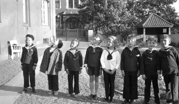 John Lund, Gulbrandsen, Stig Borthen, Tage Munthe-Kaas, Rolf Sundt jr., Herman Kragh, Otto Grieg Tidemand, Anders Østbye står sammen i Heftye terrassen på 7-årsdagen til Rolf Sundt jr. 24. juni 1928.