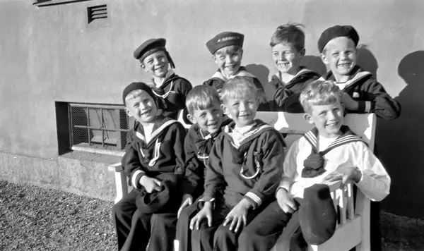 Anders Østbye, Tage Munthe-Kaas, Herman Kragh, John Lund, Gulbrandsen, Otto Grieg Tidemand, Stig Borthen og Rolf Sundt jr. står sammen i Heftye terrassen på 7-årsdagen til Rolf Sundt jr. 24. juni 1928.