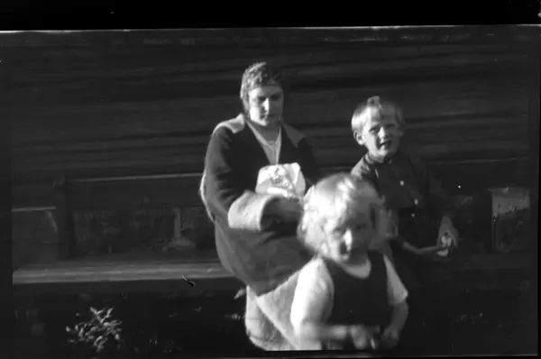 Hilda Sundt sitter med sine sønner Rolf jr. og Julius på en benk på Villa Knyggen. Fotografert 1923.