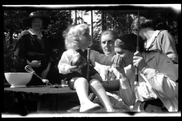Alfhild Ferslew, Rolf Sundt jr., Hilda Sundt, hennes mor Birgitte Aubert og søster Julie (Lillemor) Thaulow Aubert sitter rundt et bord ved Villa Knyggen. Fotografert 1923.