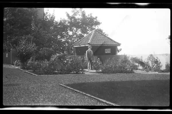 Rolf Sundt sr. står foran et lysthus, Thomas Heftyes gate 42, Oslo. Fotografert 1926.