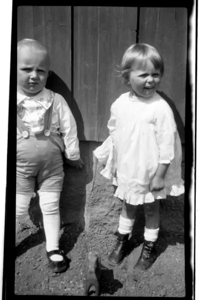 Julius Sundt står sammen med sin kusine Elsa Sundt utenfor Villa Knyggen. Fotografert 1918.