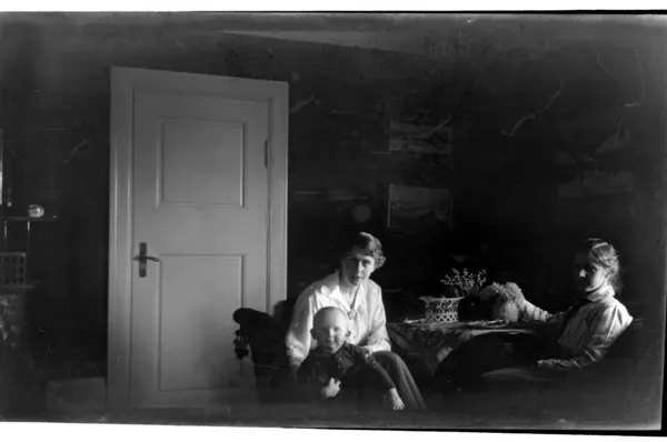 Birgit Aubert, Julius Sundt og Hilda Sundt sitter sammen i peisestuen, Villa Knyggen. Fotografert 1919.