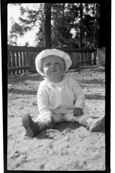 Julius Sundt ca. 1-2 år sitter på terrassen, Villa Knyggen. Fotografert 1918-1919.