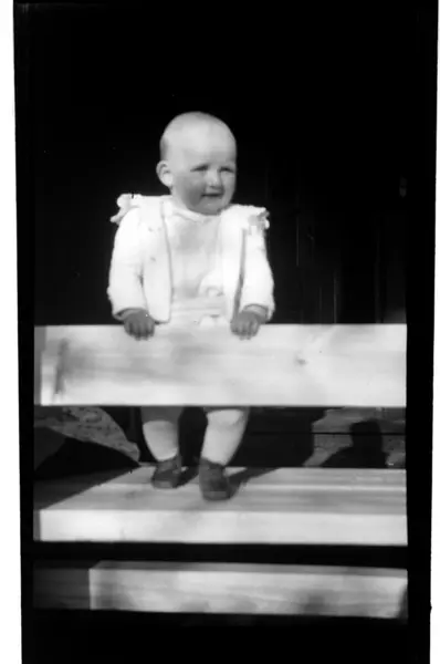 Julius Sundt, ca. ett år, på en benk, Villa Knyggen. Fotografert 1918-1919.