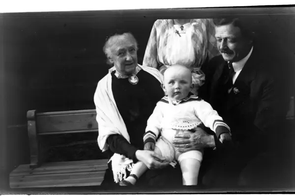 Julius Sundt mellom sin oldemor Hilda Aubert og morfar Julius Thaulow Aubert, Villa Knyggen. Fotografert 1918-1919.