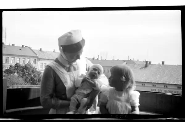 Nyfødte Julius Sundt ligger i armene på pleierske, en liten jente sitter ved siden av, Frederik Stangs gate. Fotografert 1917.