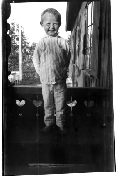 Julius Sundt, 1-2-år, står på veranda, Villa Knyggen. Fotografert 1918-1919.