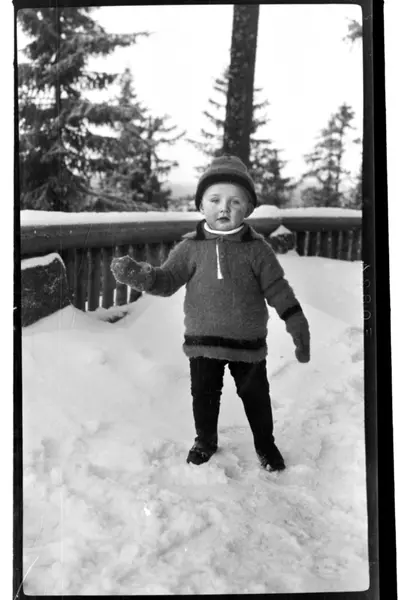 Julius Sundt står ute med snø rundt seg, Ville Knyggen. Fotografert 1918-1919.