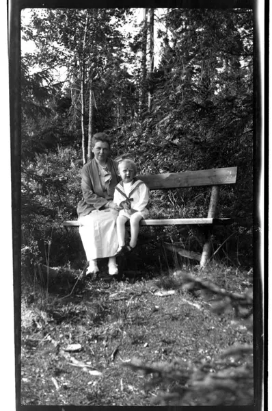 Sofie Edvardsen og Julius Sundt, ca. tre år, sitter sammen på en benk, Villa Knyggen. Fotografert 1920.