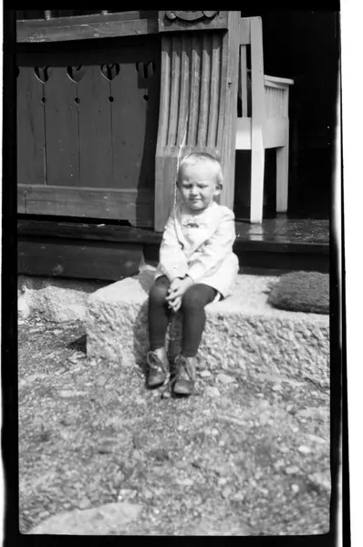 Julius Sundt, ca 4 år, sitter på en trapp, Villa Knyggen. Fotografert 1918-1919.