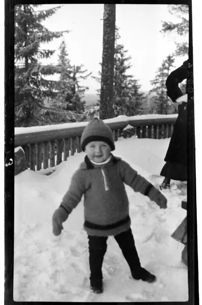 Julius Sundt står på verandaen med masse snø, Villa Knyggen. Fotografert 1918-1919.