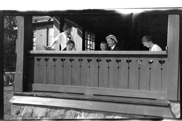 Hilda Sundt, Birgitte Aubert, Julius Sundt, Julius Thaulow Aubert og Birgit Aubert sitter på vestre veranda, Villa Knyggen. Fotografert 1918-1919.