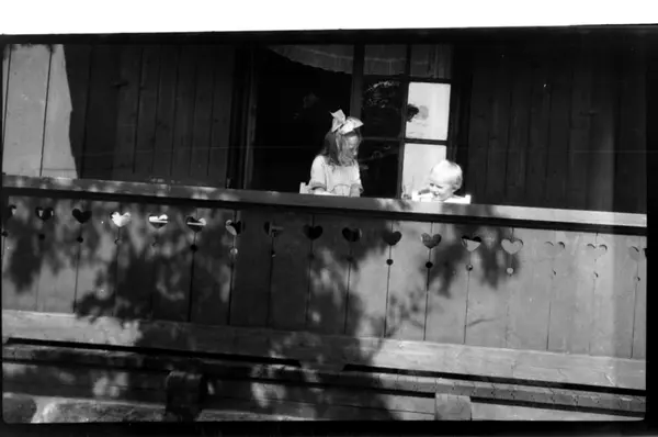 En ukjent jente og Julius Sundt på verandaen, Villa Knyggen. Fotografert 1918-1919.