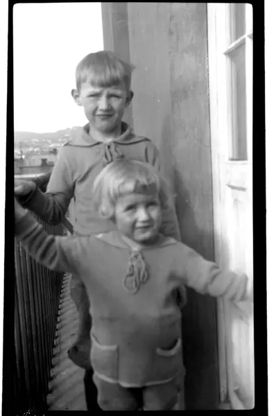 Brødrene Julius og Rolf jr. Sundt på verandaen i Thomas Heftyes gate 42E. Fotografert 1923-1924.
