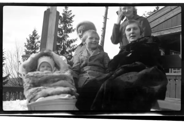 Rolf Sundt jr., en ukjent dame, Julius Sundt, Julie Cecilie (Essemor) Sundt og Hilda Sundt, Villa Knyggen. Fotografert 1922.