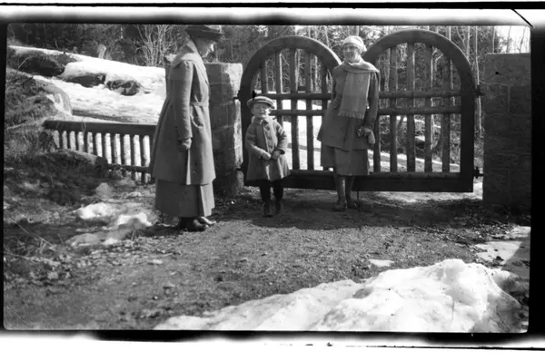 Julius Sundt står mellom sin mormor Birgitte Aubert og sin mor Hilda Sundt foran porten, Villa Knyggen. Fotografert 1918.
