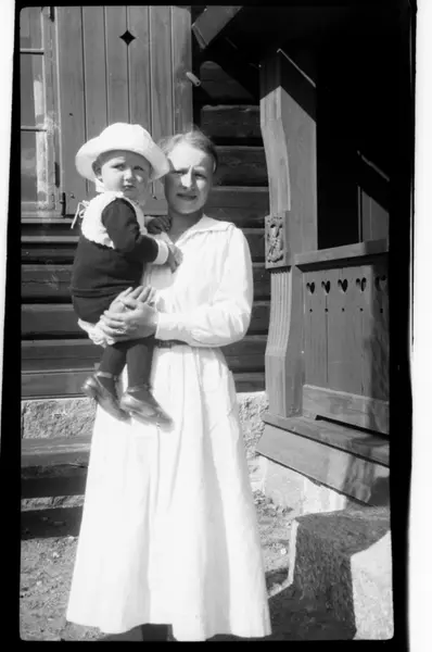 Julius Sundt, ca. to år, sitter på armen til en barnepike, Villa Knyggen. Fotografert 1918-1919.