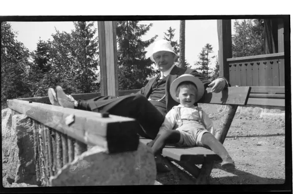 Julius Thaulow Aubert Sundt sitter på en benk sammen med sin morfar Julius Sundt, Villa Knyggen. Fotografert 1920.