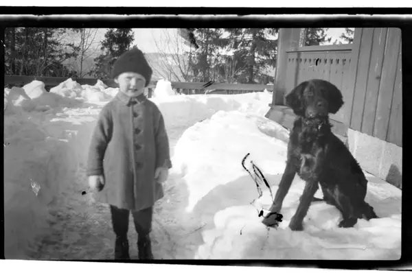 Julius Sundt og Rollo står ute i snøen, Villa Knyggen. Fotografert 1920.