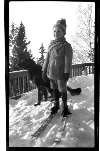 Julius Sundt, ca. fire år, står på ski ved gjerdet, Villa Knyggen. Fotografert 1921.