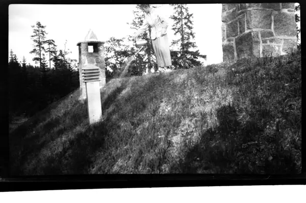 Hilda Sundt vanner torven på taket på Villa Knyggen. Fotografert 1918-1919.