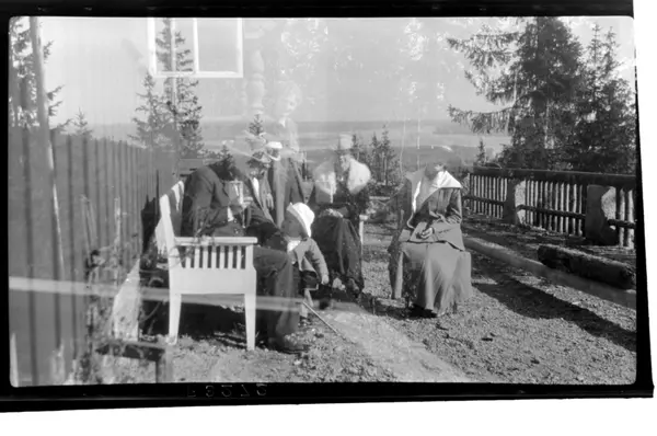 Diverse personer sitter utendørs på Villa Knyggen (dobbelteksponering). Fotografert 1918-1919.