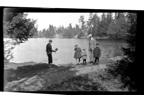 Familien Sundt på tur ved Tryvann i Oslo. Fra venstre Hilda, Julius, Rolf Jr., Rolf Sr. og Einar Aubert Hansen. Fotografert 1925.