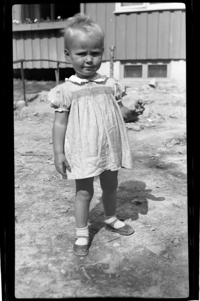 Kirsten Sundt foran hjemmet i Holmengrenda i Oslo. Fotografert 1949.