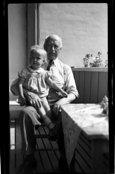Rolf Sundt Sr. med barnebarnet Kirsten på verandaen i Holmengrenda i Oslo. Fotografert 1949.