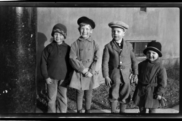 Tre lekekamerater foran Thomas Heftyes gate 42 i Oslo. Fra venstre Stig Borthen, Rolf Sundt Jr. og vaktmesterens barn John og Kari Lund. Fotografert 1926.