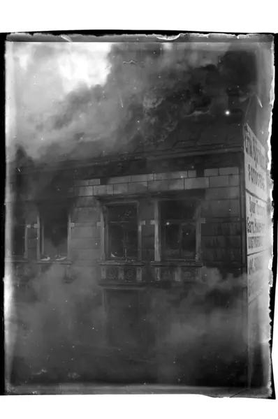 Brann i bygård, antagelig storbrannen i Kongens gate 20 i Kristiania. Fotografert 1903.