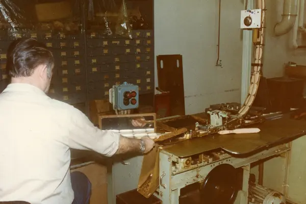 Siste dag for produksjon av ovale pappesker for snus på (antatt) Tiedemanns eskefabrikk på Bergensgate.
