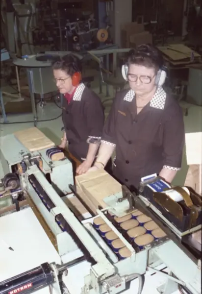 Siste dag for produksjon av ovale pappesker for snus på (antatt) Tiedemanns eskefabrikk på Bergensgate.