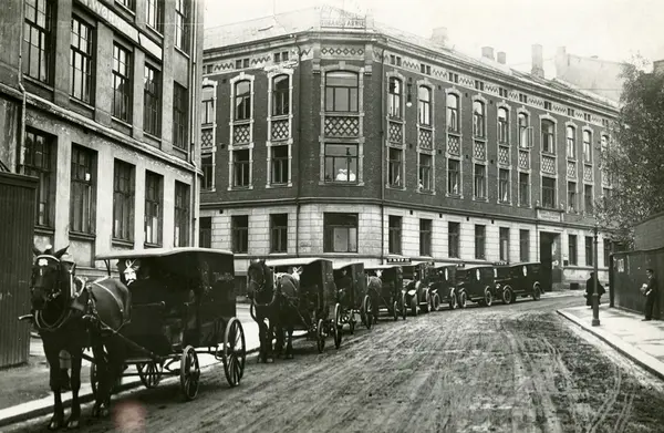 Hestevogner og biler fra Tiedemann utenfor fabrikken på Stensberggata i Oslo.