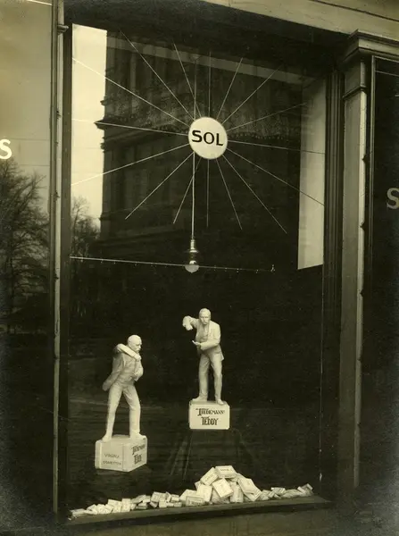 Vindusutstilling med reklame for Tiedemanns Teddy sigaretter. Antatt på Sol på Drammensveien 8 (idag Henrik Ibsens gate 28) i Oslo.