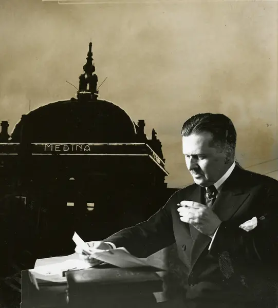 Portrett fra serien "Tidens menn om Tiedemann" laget av reklameavdelingen på J. L. Tiedemanns Tobaksfabrik. Til alle portretter hører sitater og signaturer. Her journalist og teatersjef Axel Otto Normann.