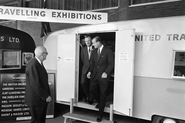 Prins Philip, Hertugen av Edinburgh, besøker den britiske utstilling i 1965 i Oslo. Prinsen kommer her først ut av en av utstillingsvognene.