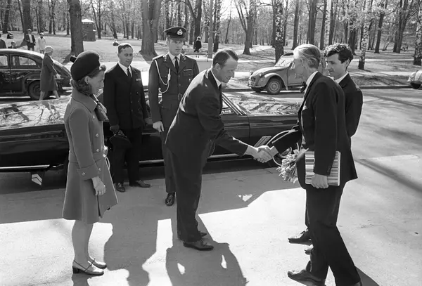 Kronprins Harald og kronprinsesse Sonja besøker utstilling. Her blir de tatt i mot av representanter for Kunstnernes Hus i Wergelandsveien i Oslo.