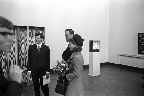 Kronprins Harald og kronprinsesse Sonja besøker utstilling i Kunstnernes Hus. Her blir de vist rundt blant diverse kunstverk av representanter for Kunstnernes Hus.