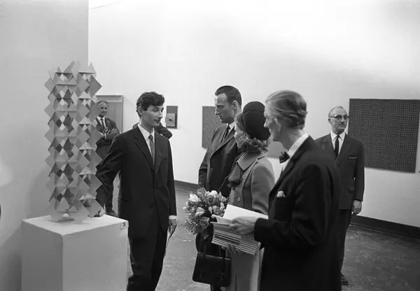 Kronprins Harald og kronprinsesse Sonja besøker utstilling i Kunstnernes Hus. Her blir de vist rundt blant diverse kunstverk av representanter for Kunstnernes Hus.