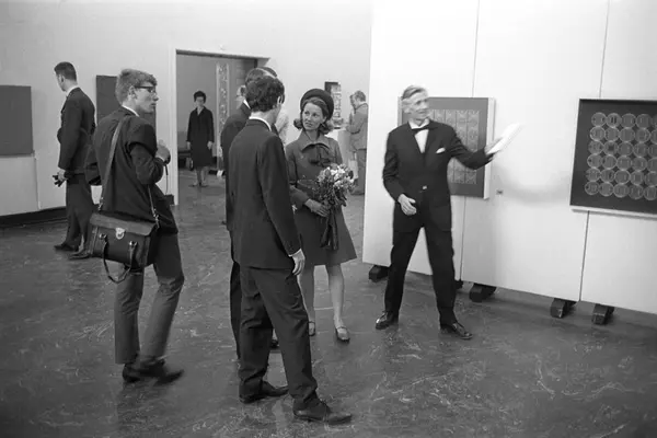 Kronprins Harald og kronprinsesse Sonja besøker utstilling i Kunstnernes Hus. Her blir de vist rundt blant diverse kunstverk av representanter for Kunstnernes Hus. Publikum i bakgrunnen.