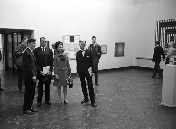 Kronprins Harald og kronprinsesse Sonja besøker utstilling i Kunstnernes Hus. Her blir de vist rundt blant diverse kunstverk av representanter for Kunstnernes Hus.