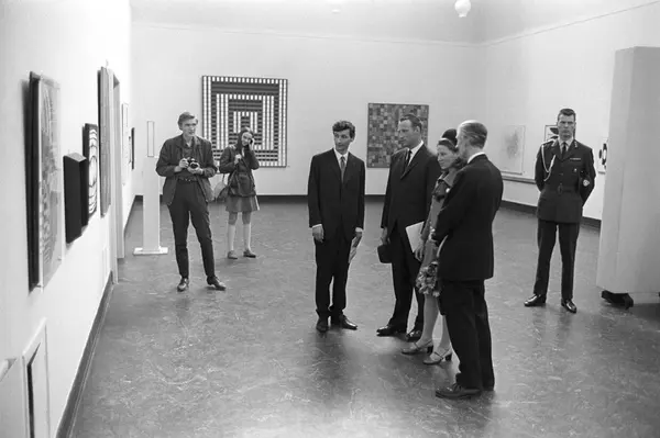 Kronprins Harald og kronprinsesse Sonja besøker utstilling i Kunstnernes Hus. Her blir de vist rundt blant diverse kunstverk av representanter for Kunstnernes Hus.