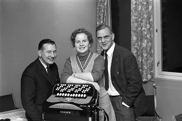 Tre glade gjøglere som skal ut på turné til sjøfolkene. Fra venstre: John Fjeldbu, Birgitte Grimstad og Rolf Søder.