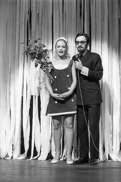 Bursdagsfeiring av Lill-Babs, Barbro Svensson, på Chat Noirs scene. Lill-Babs sammen med ukjent person.