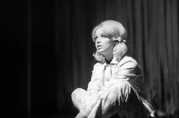 Bursdagsfeiring av Lill-Babs, Barbro Svensson, på Chat Noirs scene. Her er Lill-Babs i et revynummer.