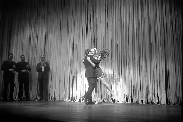 Bursdagsfeiring av Lill-Babs, Barbro Svensson, på Chat Noirs scene. Fem herrer ble fløyet inn til feiringen og her får Lill Babs blomster. Direktør Totto Johannessen nr. 2 fra høyre i rekken av menn.