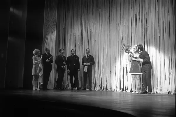 Bursdagsfeiring av Lill-Babs, Barbro Svensson, på Chat Noirs scene. Fem herrer ble fløyet inn til feiringen og her får Lill Babs blomster. Direktør Totto Johannessen nr. 2 fra høyre i rekken av menn. Grynet Molvig ytterst til venstre.