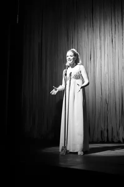Bursdagsfeiring av Lill-Babs, Barbro Svensson, på Chat Noirs scene. Her er Lill-Babs, i et revynummer.